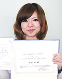池田 麻衣子 さん マスターセラピスト資格取得 私のきっかけは多分皆さんと同じだと思いますが、手に職がつけたい、どうせなら人のためになることがしたくって、マッサージ好きだったためにこの仕事を極めようかと・・。少しでも多くの人のためになりたいですね。 授業はほんとに和やかで仲間も団結できて楽しく過ごせました。繰り返し受講はどれくらいしたか忘れるくらい。だから受講料は2分の1どころか3分の1ぐらいの安さを実感しています。 絶対何回も繰り返し練習してチェックしないと技術って身に付かないということが分かりました。親しみやすく、良き先輩で、相談できる友人でもあった先生方、ありがとうございました。 授業内容は最高でしたがテスト範囲は広く勉強が大変でした。でも試験に合格した事を誇りに思えます。これからは学んだことを活かして新しいチャレンジをしたいと思います。 技術の授業ではお互いのカラダを触れ合うのですぐ仲良くなれるので、後輩の皆さんも安心して頑張ってくださいね。